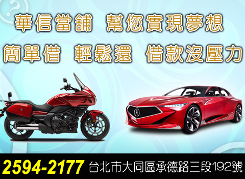 - 借錢借到面子盡失?華信萬華區當舖提供既安全且可靠的資金,汽車借款/機車借款利率低,萬華區借錢快速拿款免留車,業界口碑好,不限車種車齡皆可貸,愛車來即可借,結合傳統與現代化經營借貸,隨到隨辦解決您的需求,快速借輕鬆還,當日可放款,立即來電洽詢。